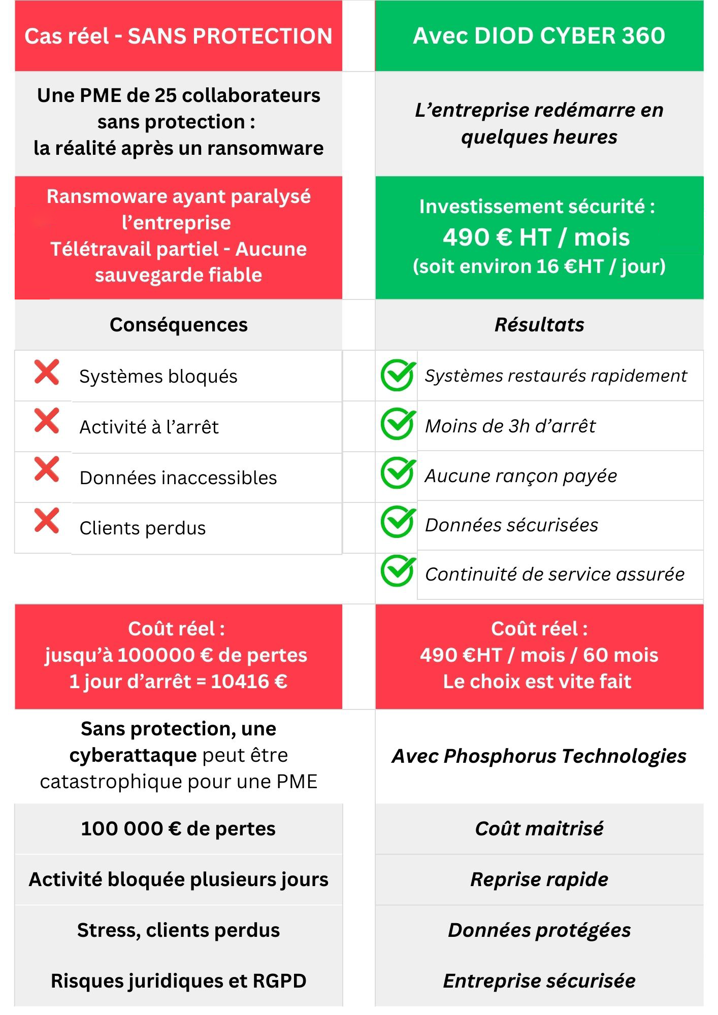 Voici un cas réel d'une PME de 25 collaborateurs : Une cyberattaque leur a coûté100 000 € Si elle avait eu DIOD CYBER 360 elle aurait pu redémarrer en quelques heures.